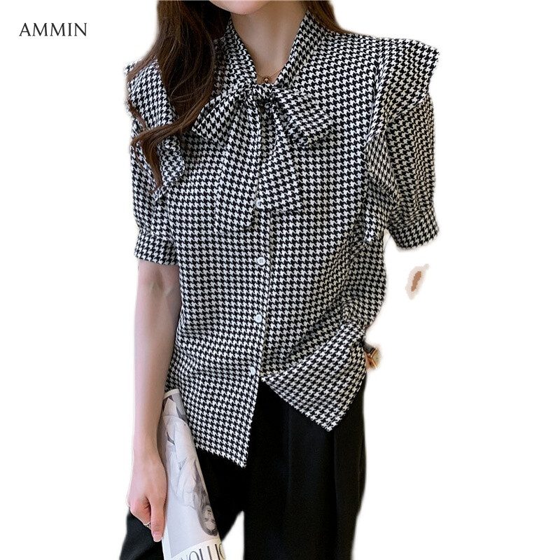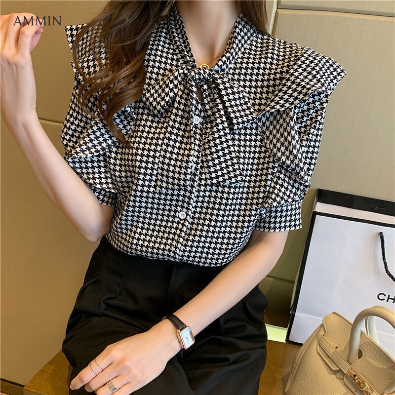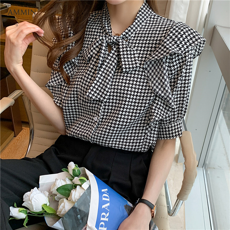 AMMIN New Korean version of the V-neck bowknot printed short-sleeved chiffon shirt temperament ruffle stitching all-match loose plaid blouse top