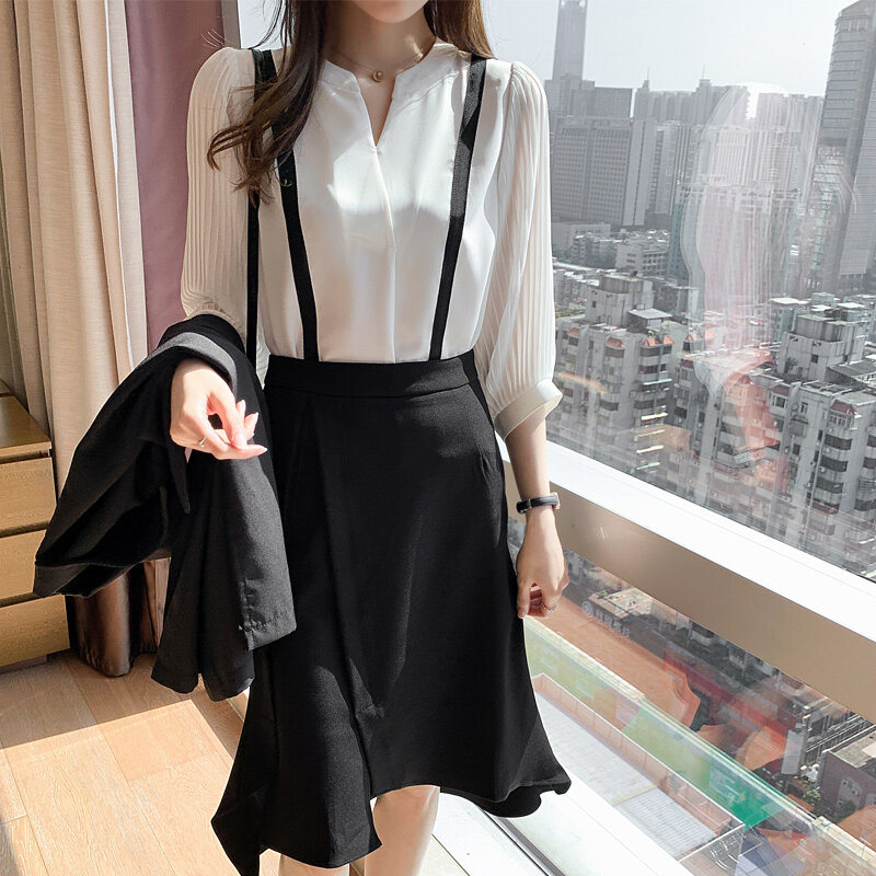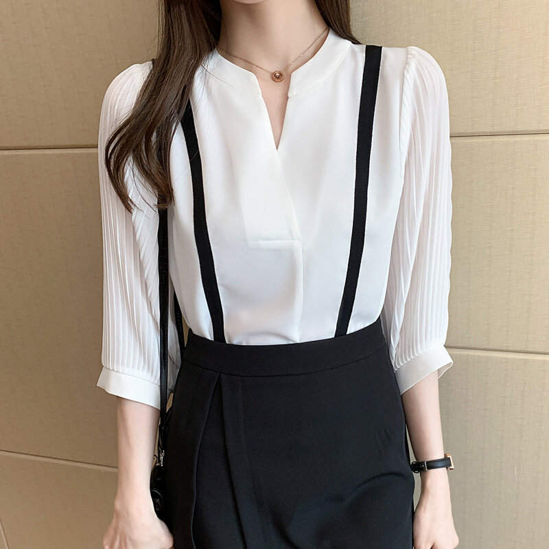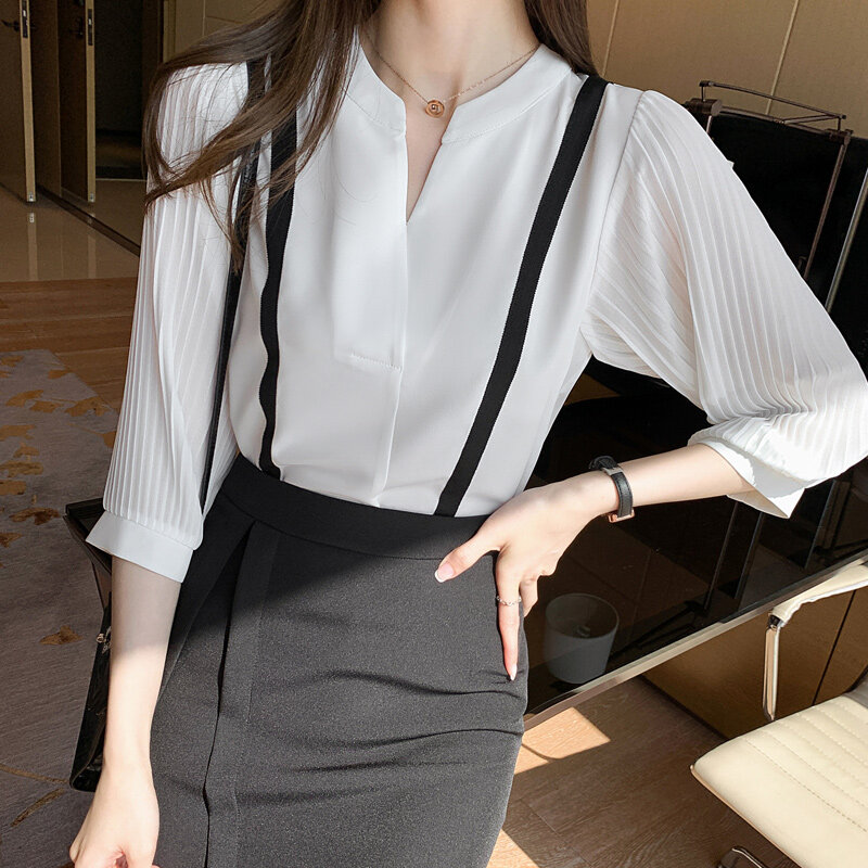 AMMIN 2022 Autumn new sweet chic high-grade white chiffon shirt Korean-style fashion temperament V-neck ruffle lantern sleeve chiffon top For women