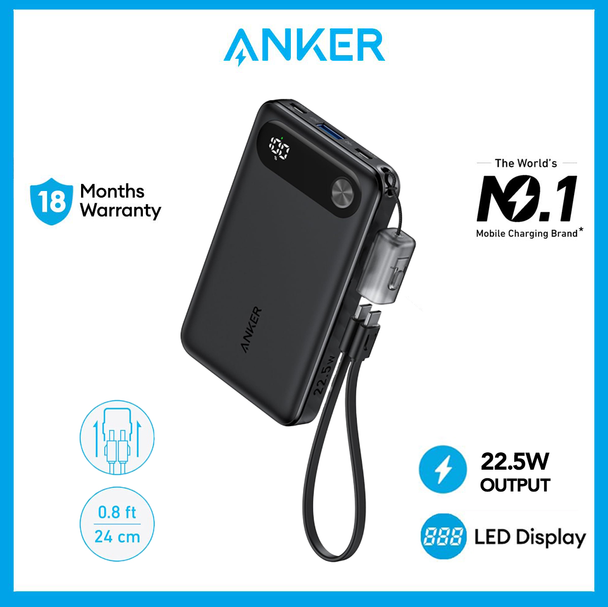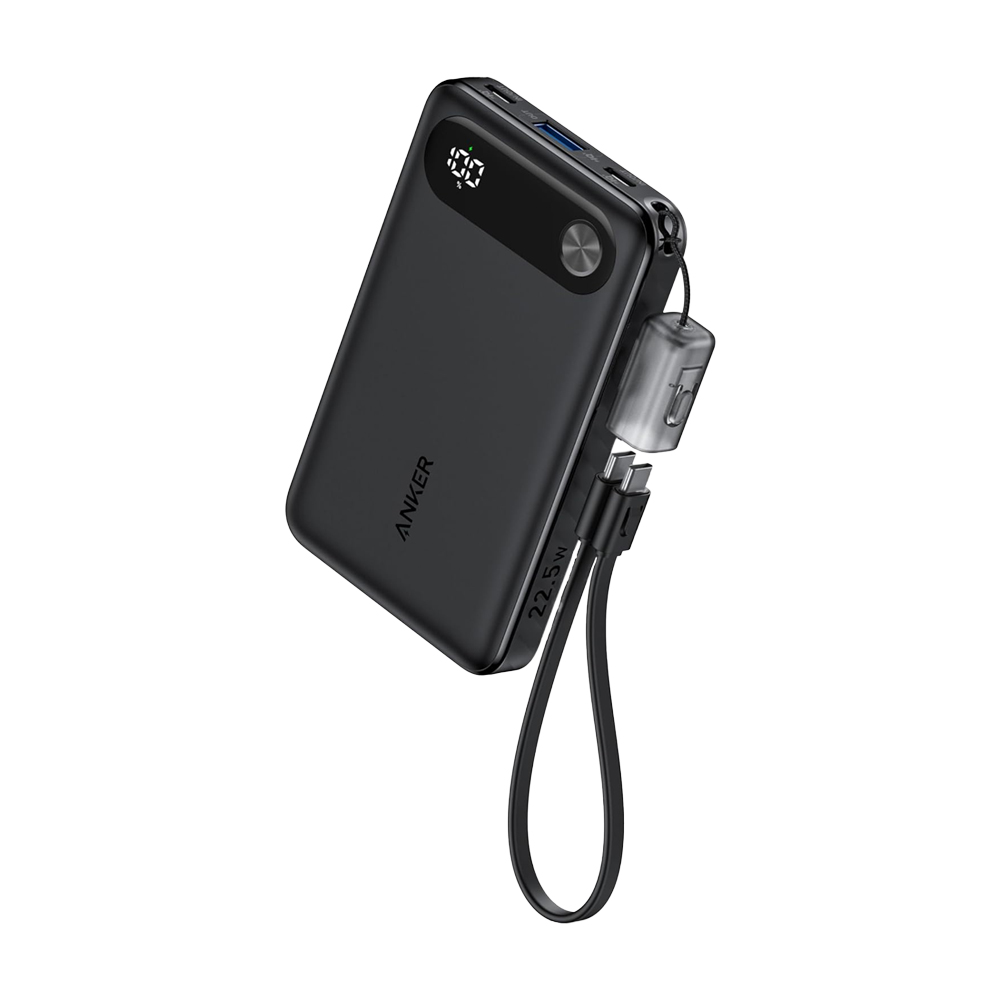 with Built-in USB-C Cable and Lanyard, 22.5W Max Output with 2 USB-C and 1 USB-A Port, Battery Pack