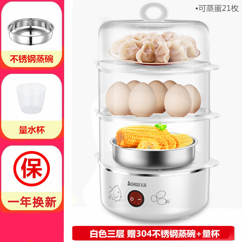 Chigo Egg Steamer Household Single Double Layer Three Egg Boiler Semi-automatic Power off 304 Stainless Steel Breakfast Machine Multi-Function