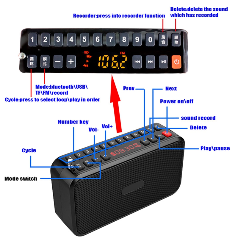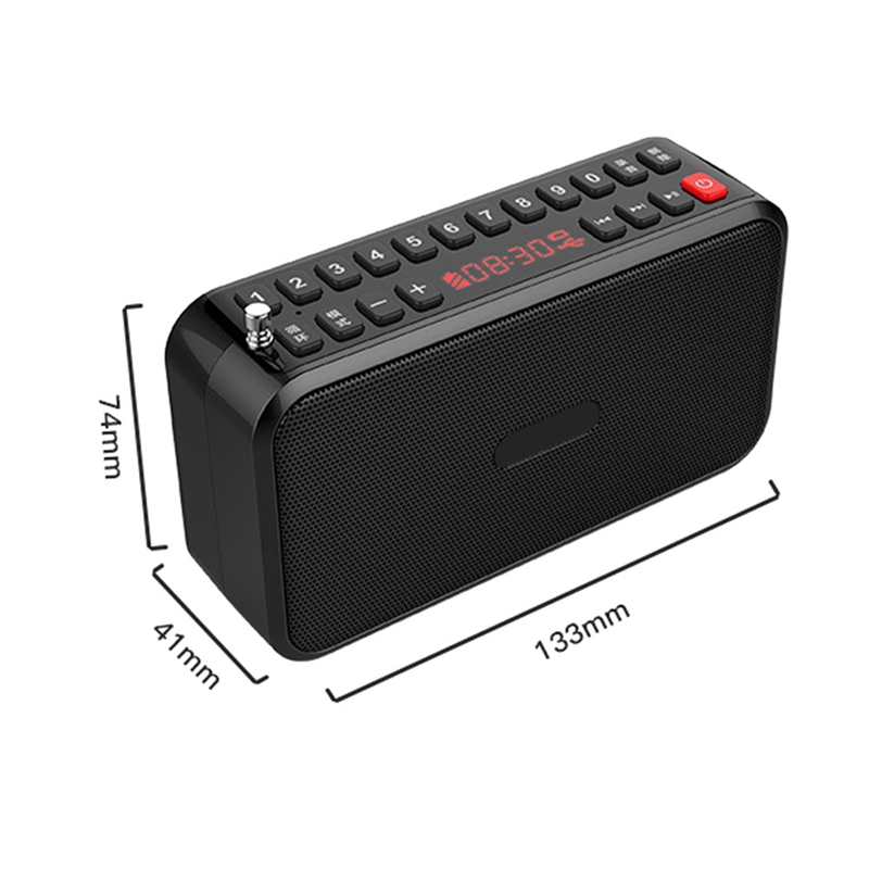 Function: Bluetooth 5.0/Hands-free calll/Sound recorder/FM radio /TF card play /USB disk play FM frequency:87.5MHz~108MHz Rated power: 5w Frequency response: 100Hz~18KHz Size:133x41x74mm