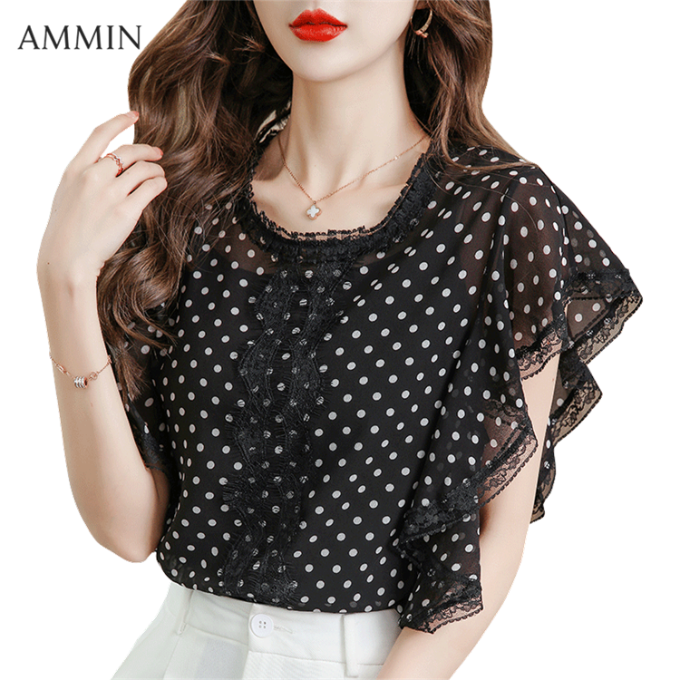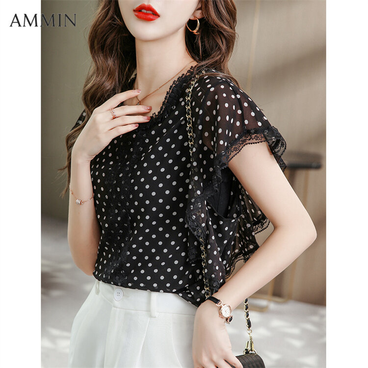 AMMIN Korean style women's short-sleeved polka-dot print lace chiffon shirt 2022 new loose fashion Western style flounce off-the-shoulder lace chiffon top
