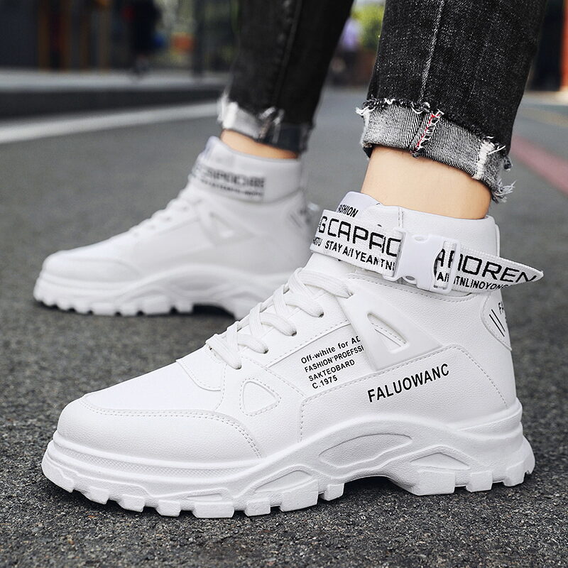 【READY STOCK】Men's high top sports shoes, outdoor casual board shoes, thick soled lightweight sports shoes, round toe lace up running shoes.