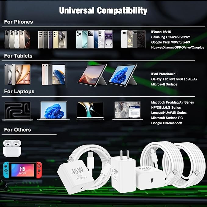 【Universal Compatibility for Super-Fast Charging】: The 45W fast charger supports most USB-C to USB-C devices, including iPhone 16 Pro/16 Pro Max/16/16 Plus, iPhone 15 Pro/15 Pro Max/15/15 Plus; compatible with AirPods Pro (2nd Gen)/AirPods 4/AirPods Max 2 (released in 2024). 3/12.9/11-inch iPad, iPad 10/11-inch (A16), iPad Air 4th/5th generation, iPad mini 6/7.