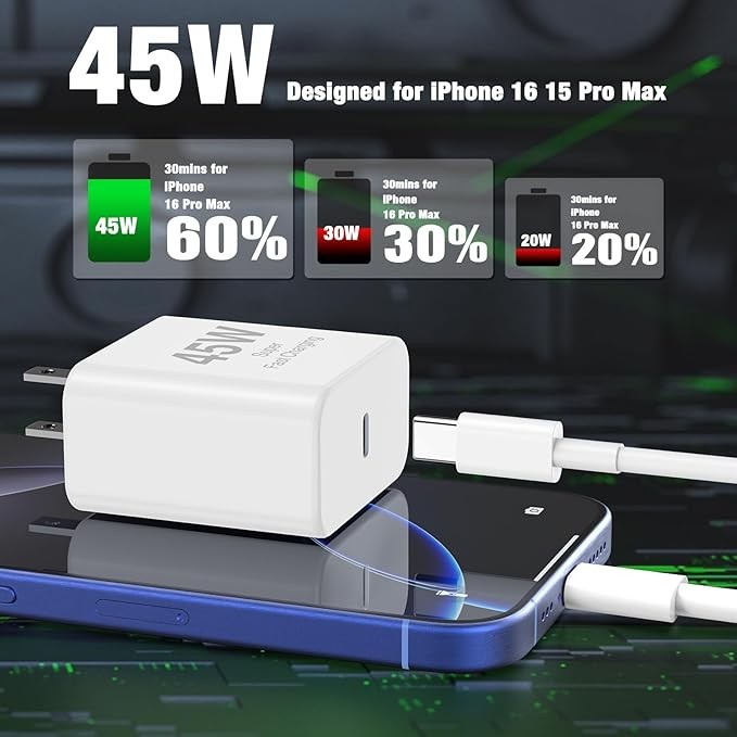 【Ultra-Fast Charging】: Designed specifically for iPhone 16 15 Pro / Pro Max, the 45W USB-C charger block delivers ultra-fast charging for your iPhone, meeting your urgent charging needs. Charges your iPhone 16 15 Pro up to 5 times faster than a 20W USB-C charger.