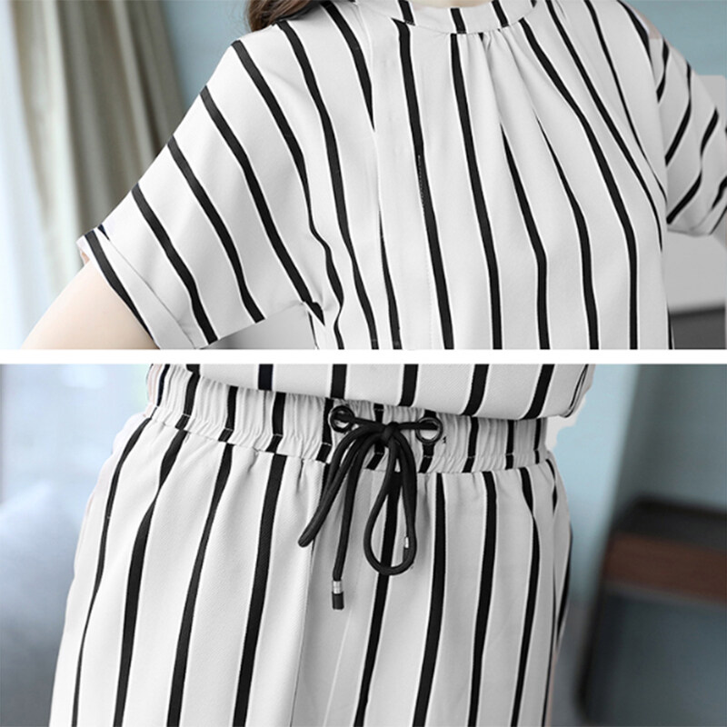 GUIN Womens Striped Leisure Suit Short Sleeved Blouse+Wide Leg Pants Two Pieces Set