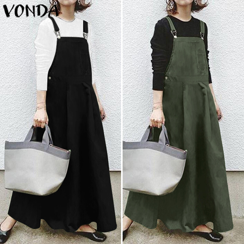 VONDA Women Sleeveless Dungaree Solid Plain Pianfore Overall Strap Long Dress