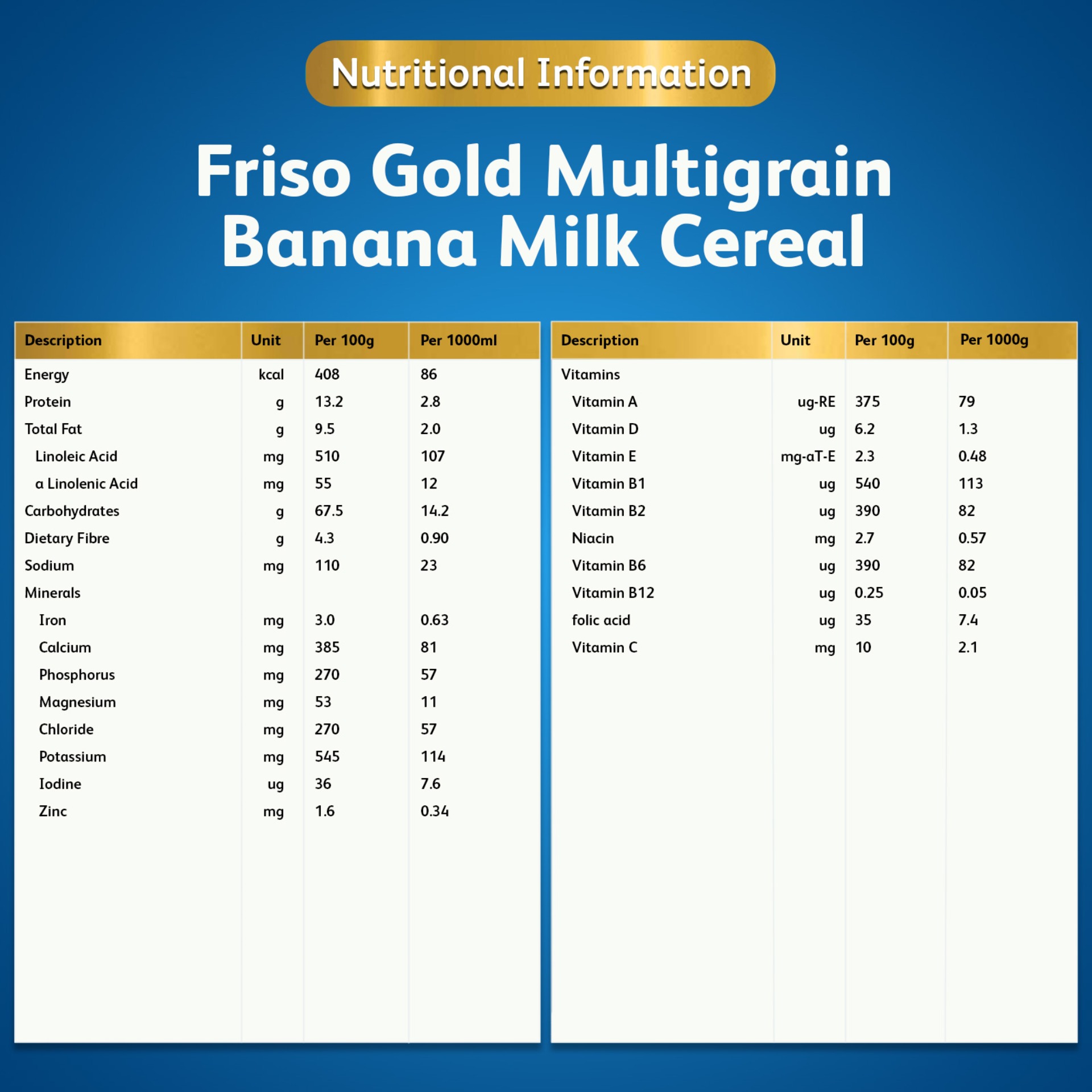 As you wean your baby, they are likely to eat less until they become more familiar with solid food. Friso Gold Multigrain & Banana milk cereal are rich in important nutrients to ensure you baby has a balanced diet. They are also made with milk powder so they taste more familiar to your baby. the smooth texture eases their first step into eating solids and is for the little tummies.