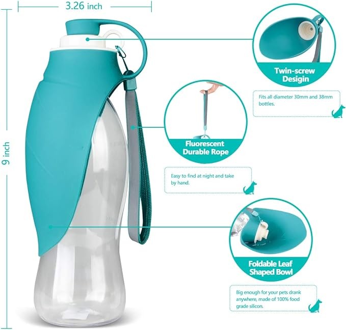 • EXCELLENT PET WATER BOTTLE: the 20 oz capacity dog water bottle with bowl which is big enough and convent for longer walking, hiking and travel. Your lovely pets can enjoy fresh water at anytime and anywhere with this bottle. A must have product for your pets heath
