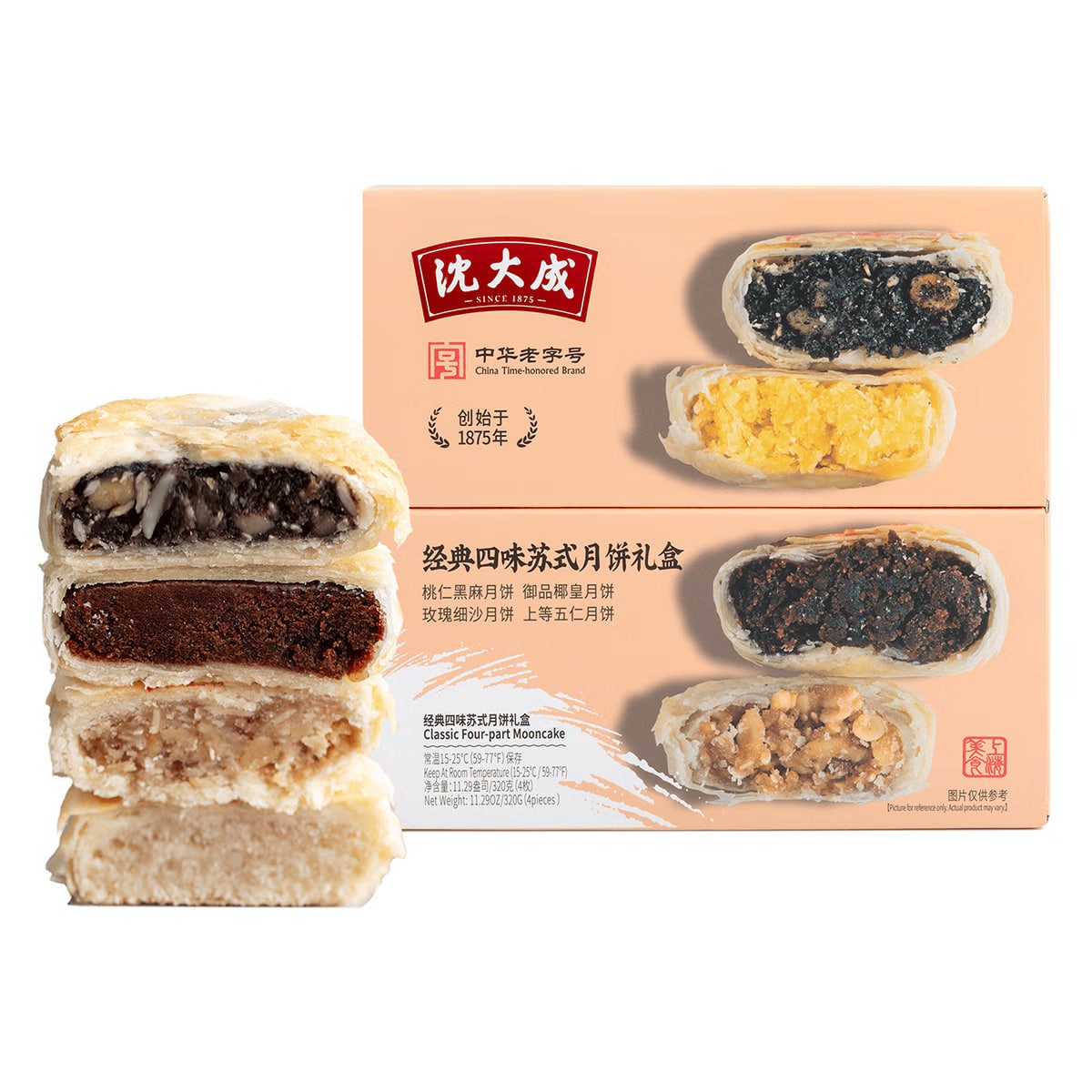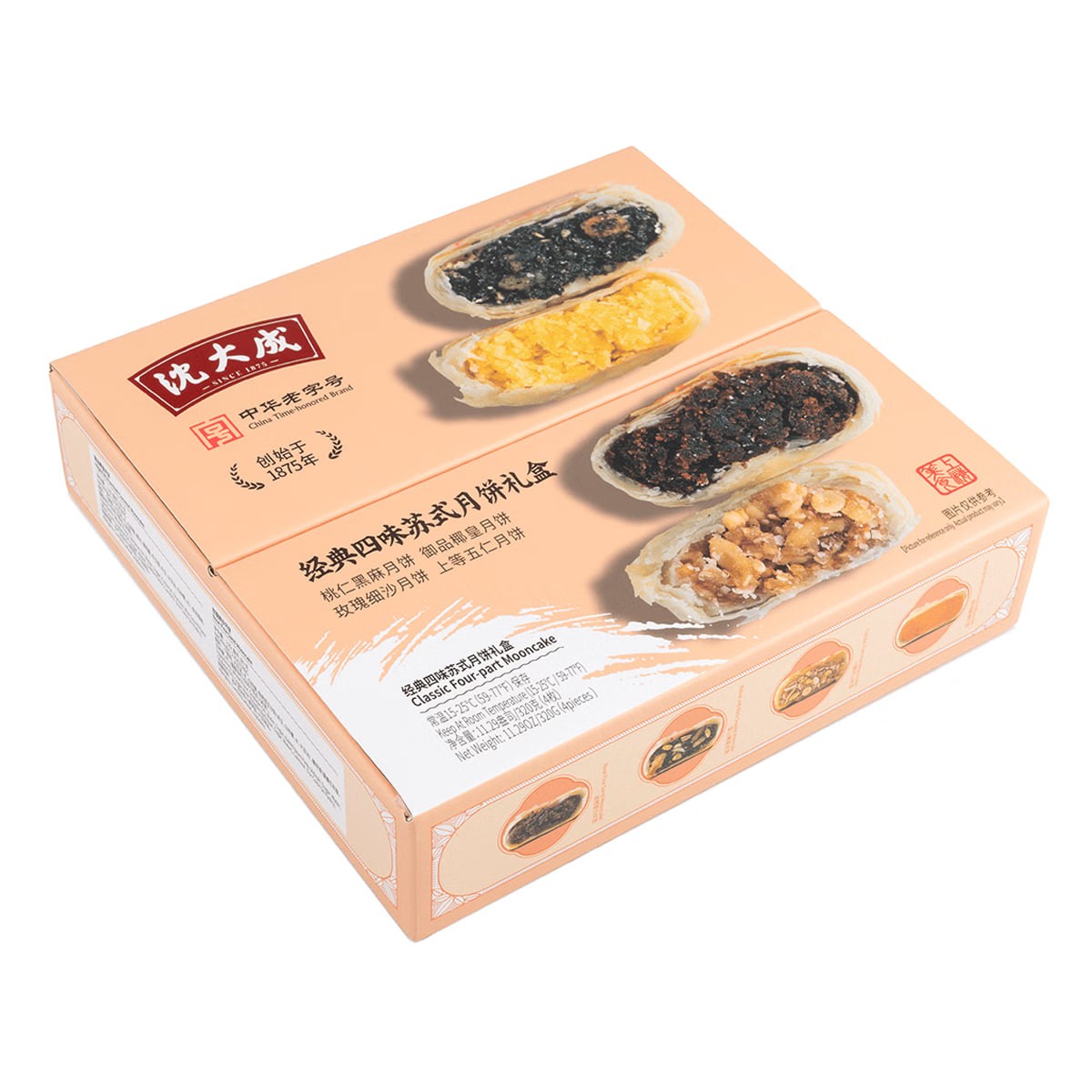 Shen Dacheng (Shanghai Time-Honored Brand) Mid-Autumn Festival Mooncakes - Classic Four-Flavor Suzhou-Style Mooncake Gift Box (4 pieces, 320g) - Black Sesame, Peach Kernel, and Five-Nut Flavors